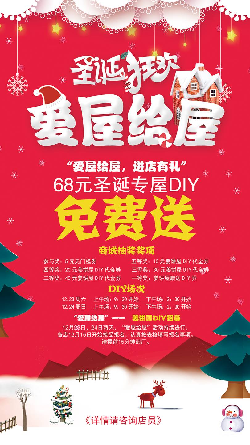 凡是稻香园顾客和粉丝均可参与微信商城“爱屋给屋”姜饼屋DIY活动抽奖,奖项有代金券和赠送券,中奖者直接在商城购买,并留下完整联系方式和参与场次,可免费参加12月23日,12月24日圣诞姜饼屋DIY活动。